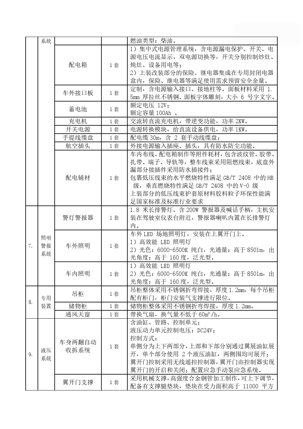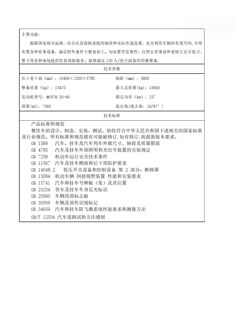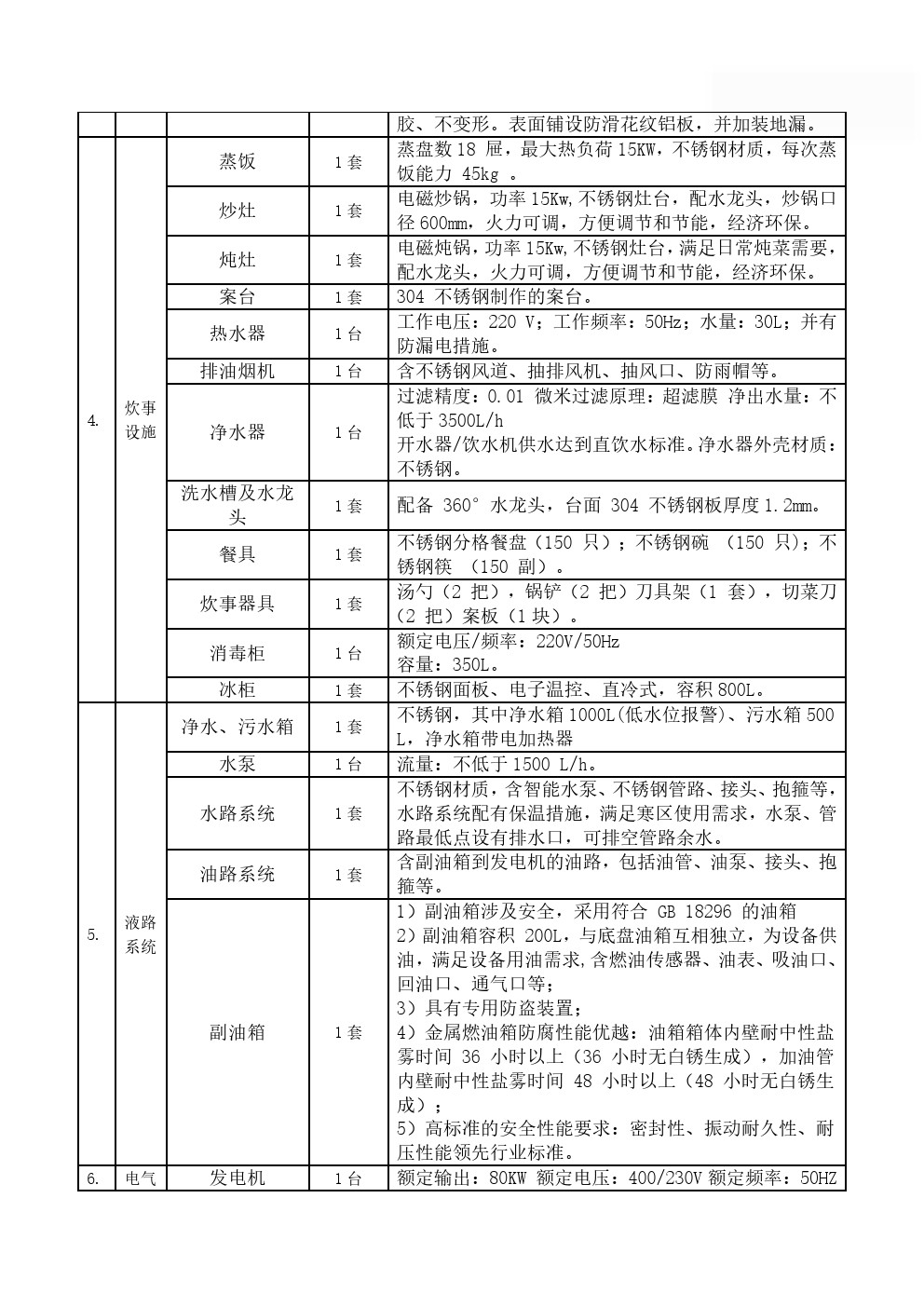 主要装备有各类炊事设备,满足50-300人用餐需求,由保温厢体、炊事设备、灶具设施、水存储、电气控制系统、水路系统、油路系统以及就餐区等组成;拥有功能齐备的食品制作设备和相应的操作空间,完全适用于野外炊事作业。