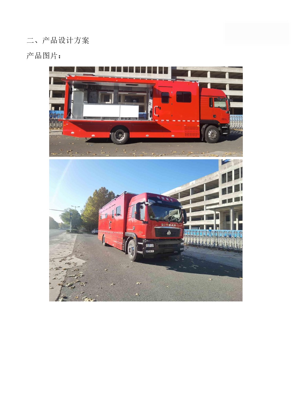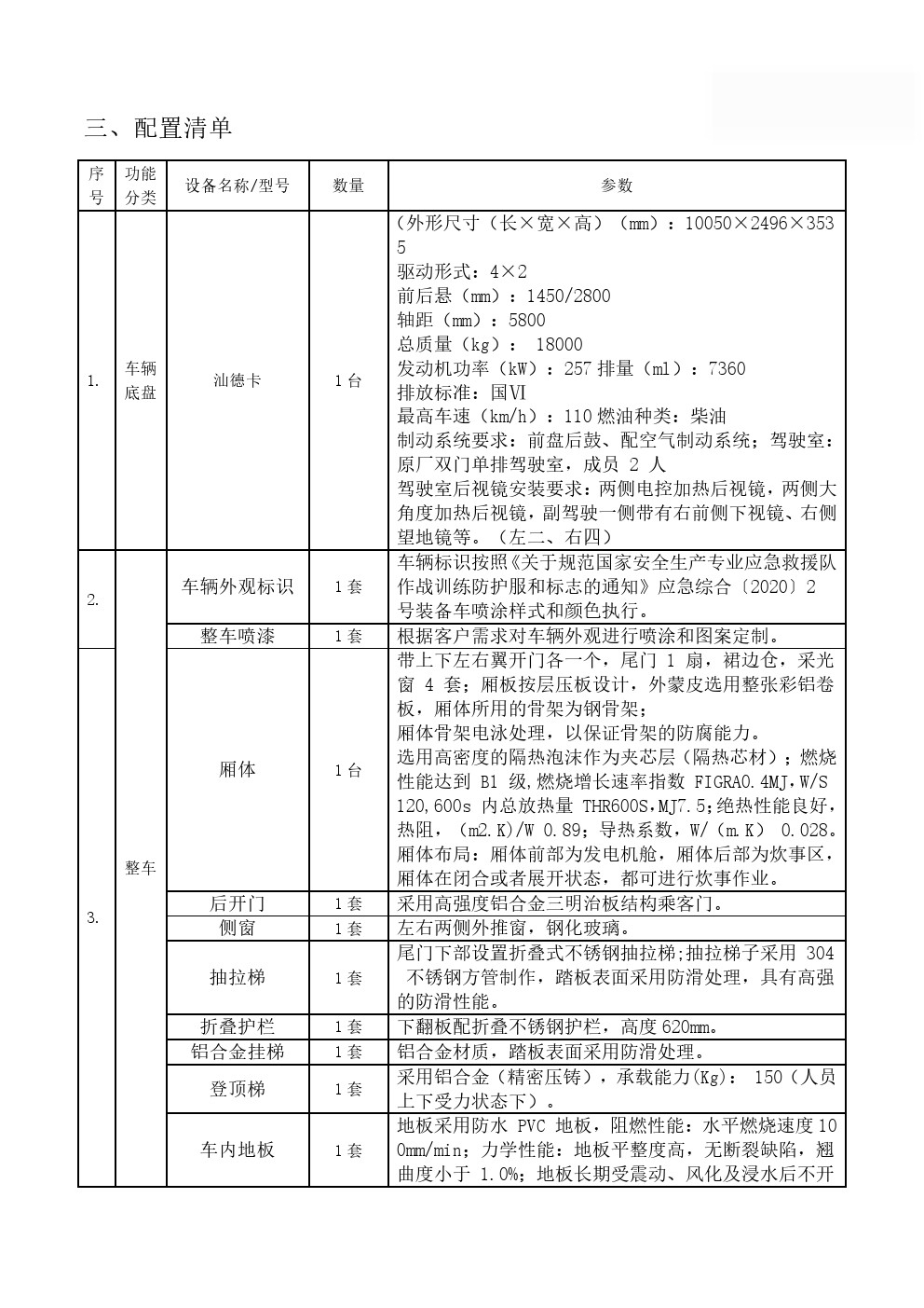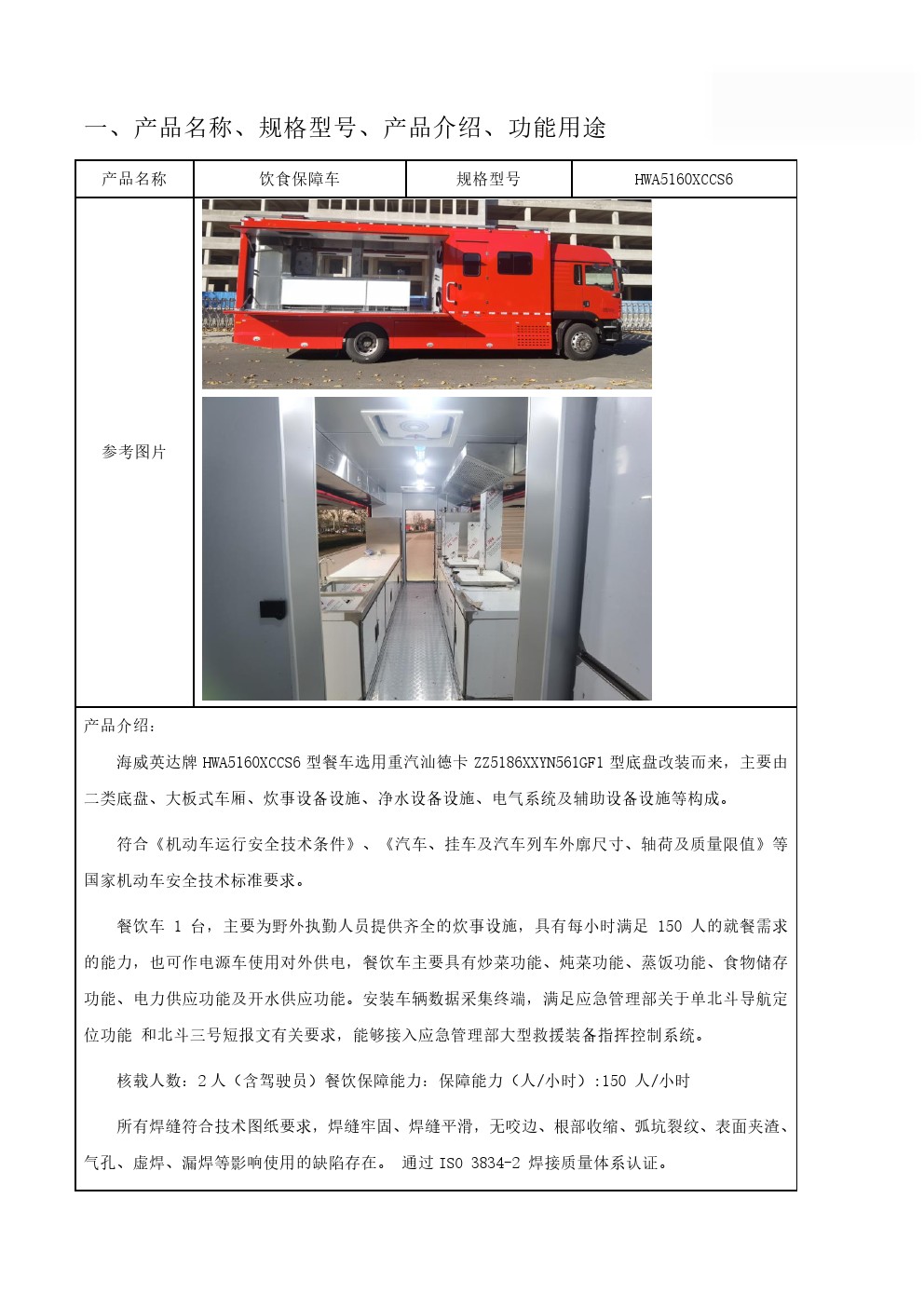 主要装备有各类炊事设备,满足50-300人用餐需求,由保温厢体、炊事设备、灶具设施、水存储、电气控制系统、水路系统、油路系统以及就餐区等组成;拥有功能齐备的食品制作设备和相应的操作空间,完全适用于野外炊事作业。